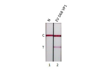 Viral envelope protein 1 (VP1) of Enterovirus D68 (EV-D68) is one of four structural proteins required to assemble the icosahedral viral capsid. VP1 is responsible for host cell attachment and viral entry into host cells. In addition, since it is located on the surface of the virion and presents serotype-specific neutralization epitopes, the gene coding for VP1 is important for serotype identification. This E. coli-expressed recombinant EV-D68 VP1 protein is purified using its N-terminal His tag.