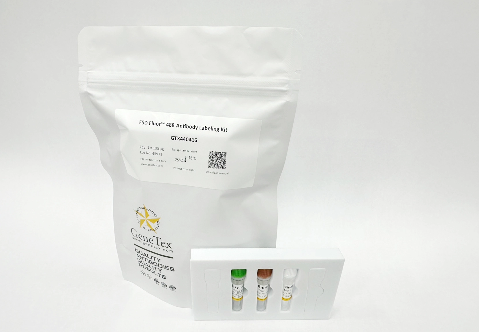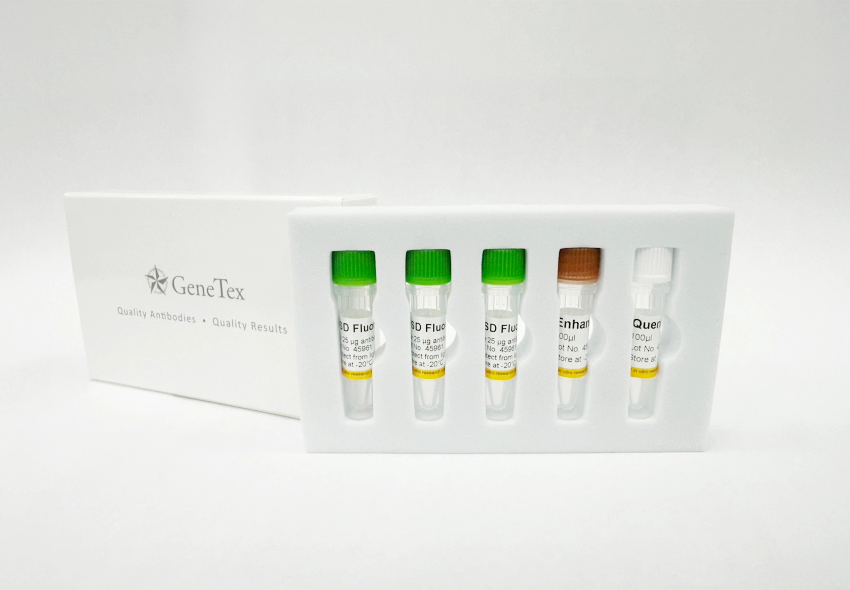 GeneTex FSD Fluor™ antibody labeling kits provide a simple and rapid method to covalently label antibodies with FSD Fluor™ NHS ester fluorescent dyes by way of the ε-amino group of lysines. The protocol requires only 10 minutes of hands-on time and the conjugated antibody is ready to use within one hour. The kits can be used with GeneTex antibodies, recombinant proteins, and biomolecules that are in PBS-only buffer or in PBS buffer with up to 20% glycerol.
