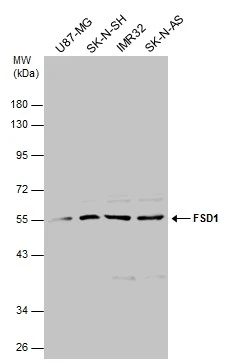 Various whole cell extracts (30 μg) were separated by 10% SDS-PAGE, and the membrane was blotted with FSD1 antibody (GTX131769) diluted at 1:1000.