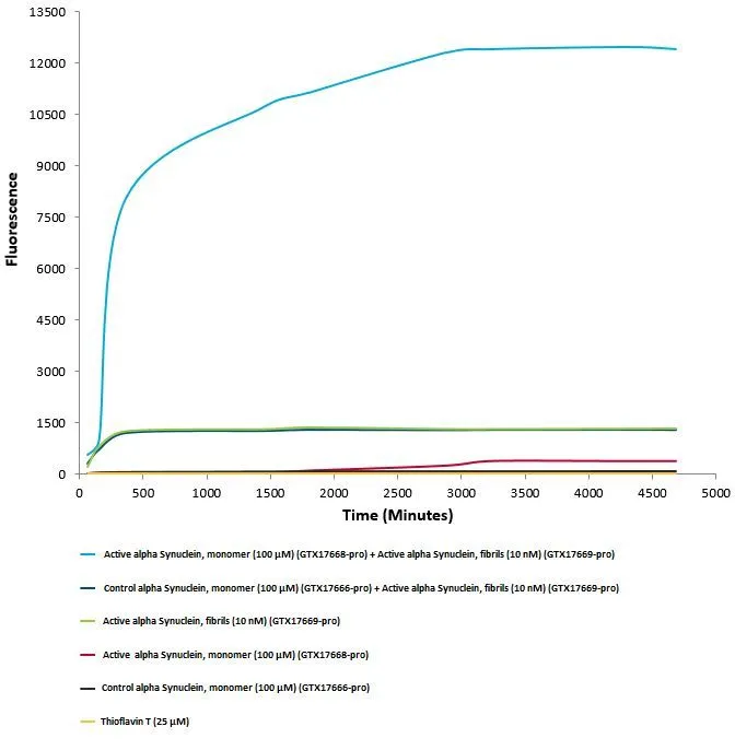 Active alpha synuclein preformed fibrils (GTX17669-pro) seed the formation of new alpha synuclein fibrils from the pool of alpha synuclein monomers (GTX17668-pro). Thioflavin T is a fluorescent dye that binds to beta sheet-rich structures, such as those in alpha synuclein fibrils. Upon binding, the emission spectrum of the dye experiences a red-shift, and increased fluorescence intensity. Thioflavin T emission curves show increased fluorescence (correlated to alpha synuclein protein aggregation) over time when 10 nM of active alpha synuclein preformed fibrils (GTX17669-pro) is combined with 100 μM of alpha synuclein monomer (GTX17668-pro), as compared to when 10 nM of active alpha synuclein preformed fibrils (GTX17669-pro) is combined with 100 μM of alpha Synuclein monomer (GTX17666-pro). Thioflavin T ex = 450 nm, em = 485 nm.