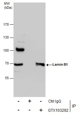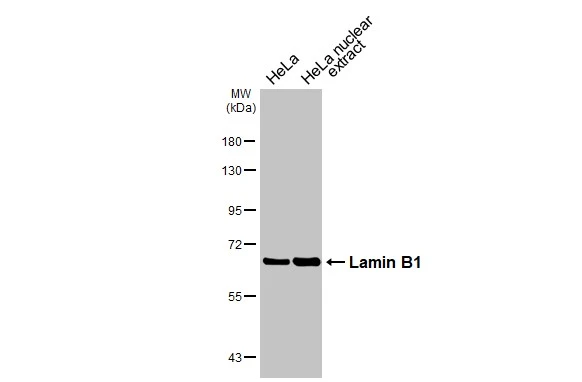 Wild-type (WT) and Lamin B1 knockout (KO) HeLa cell extracts (30 μg) were separated by 7.5% SDS-PAGE, and the membrane was blotted with Lamin B1 antibody (GTX103292) diluted at 1:10000. The HRP-conjugated anti-rabbit IgG antibody (GTX213110-01) was used to detect the primary antibody.