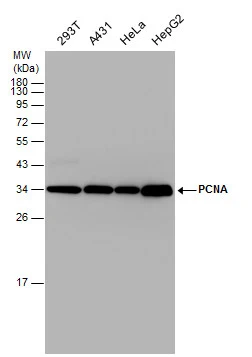 PCNA antibody recognizes the proliferating cell nuclear antigen (PCNA), a cofactor of DNA polymerase delta with a predicted molecular weight of 29 kDa. PCNA is important for DNA synthesis, repair, and epigenetic modifications, and also serves as an organelle marker of the nucleus. PCNA antibody can be used for distinguishing between early, middle, and late S-phase of the cell cycle as well as grading of different neoplasms.