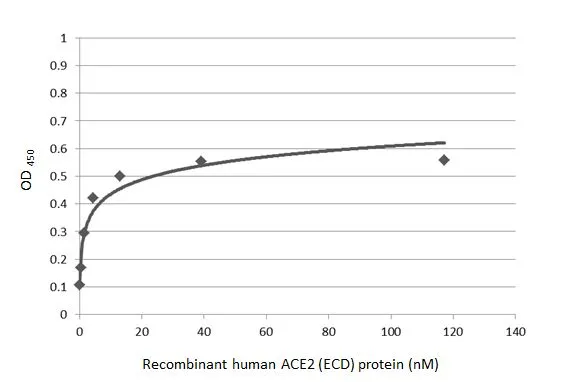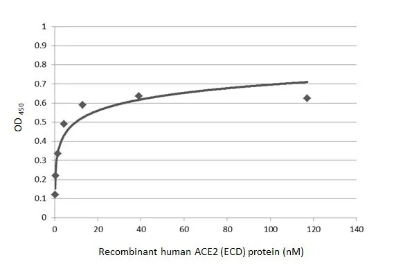 Functional ELISA analysis of immobilized recombinant (GTX136091-pro) (coated at 2 μg/mL) binding to soluble recombinant Human ACE2 (ECD) protein, mouse IgG Fc tag (active) (GTX135683-pro) (0.15-117.19 nM). Bound protein was detected by Goat Anti-Mouse IgG antibody (HRP) (GTX213111-01) (1:10000).